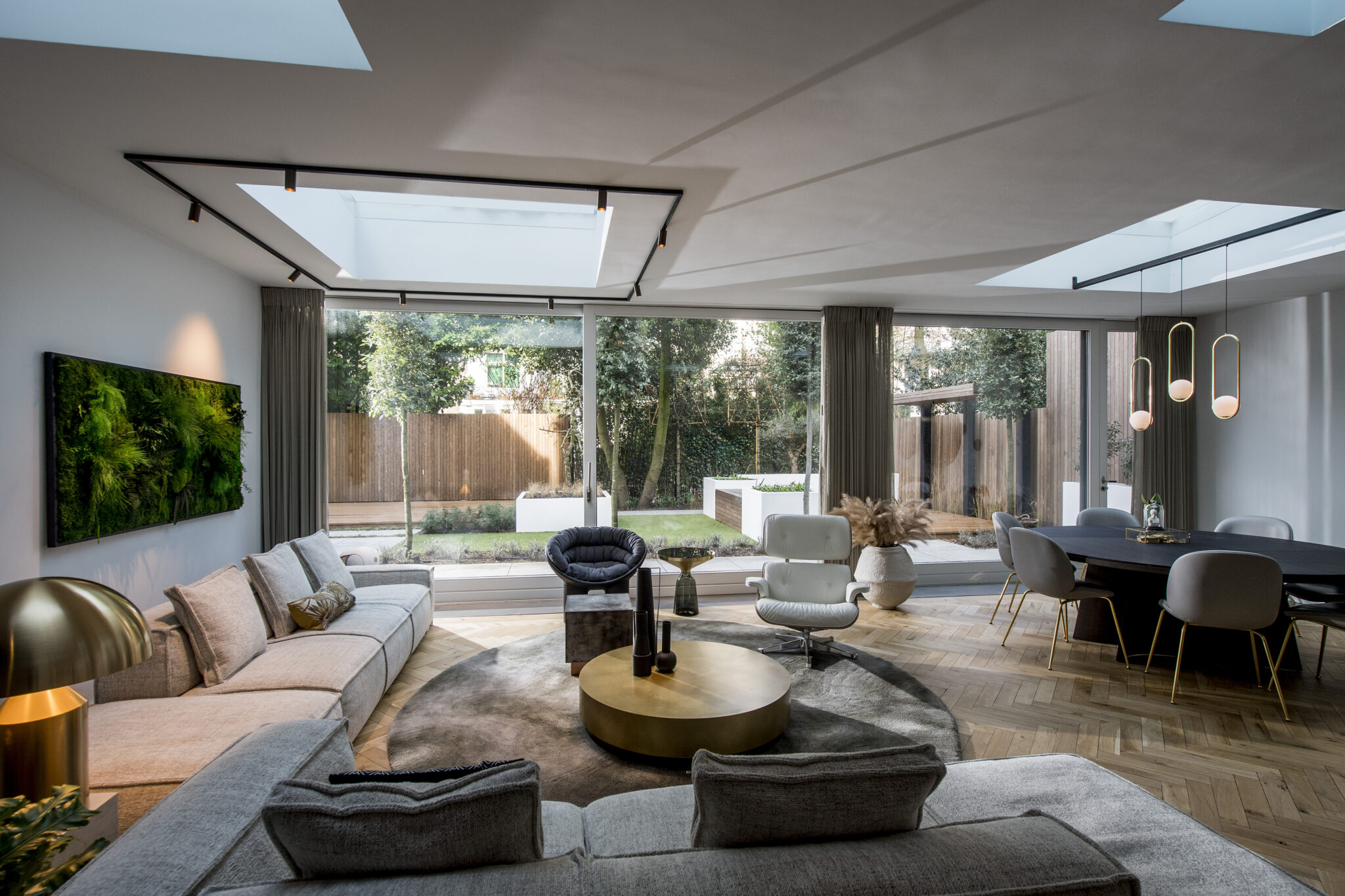 In deze riante tussenwoning in het centrum van Amsterdam realiseerden wij een totaalrenovatie van vier verdiepingen, inclusief dakterras, binnen een doorlooptijd van tweeënhalve maand. In de tweede fase, na het zwangerschapsverlof van de opdrachtgever, is de kelder omgebouwd tot een hoogwaardige bioscoopruimte en compacte gym.