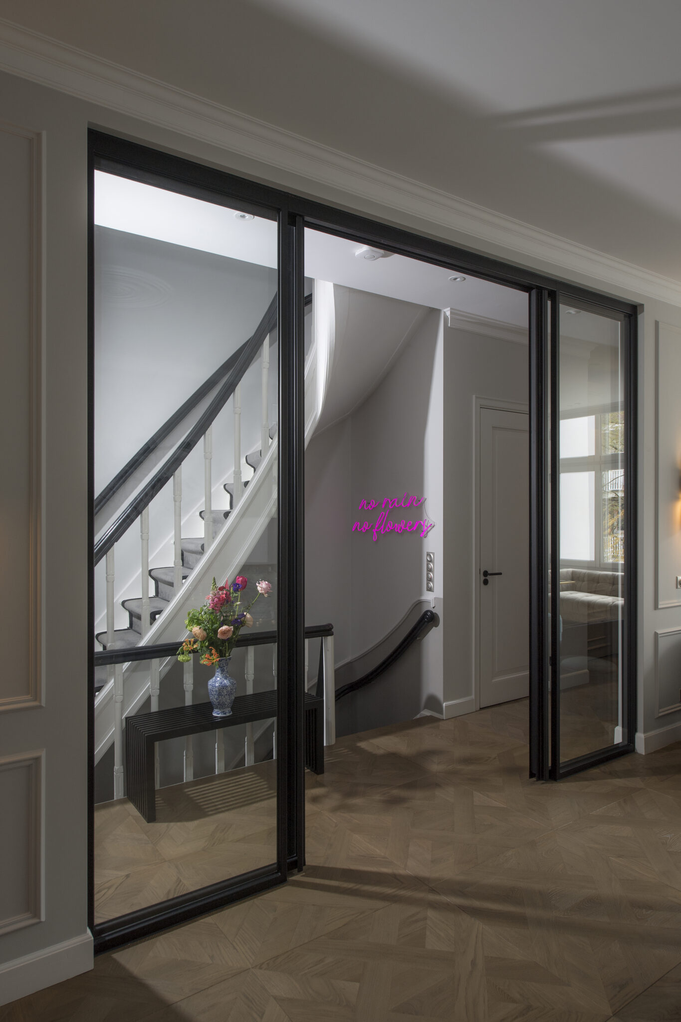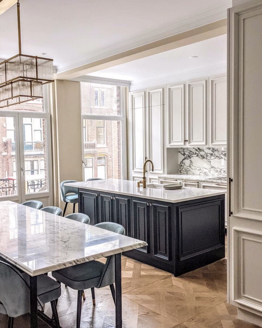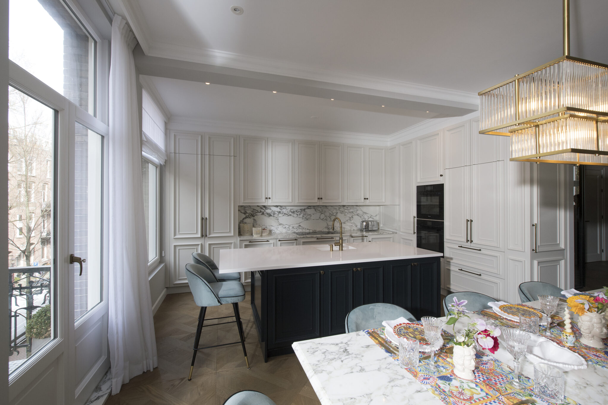 De familie heeft Engelse, Duitse en Russische roots, maar waardeert de Nederlandse charme enorm en ziet Nederland ook als hun thuis. Dat gevoel van diversiteit wilden zij graag terugzien in hun familiewoning en over elk detail is nagedacht. De klant is veel onderweg en thuis moet rust geven en opgeruimd zijn. Vandaar dat er veel slimme bergruimte is gecreeërd in het maatwerk in elke ruimte.